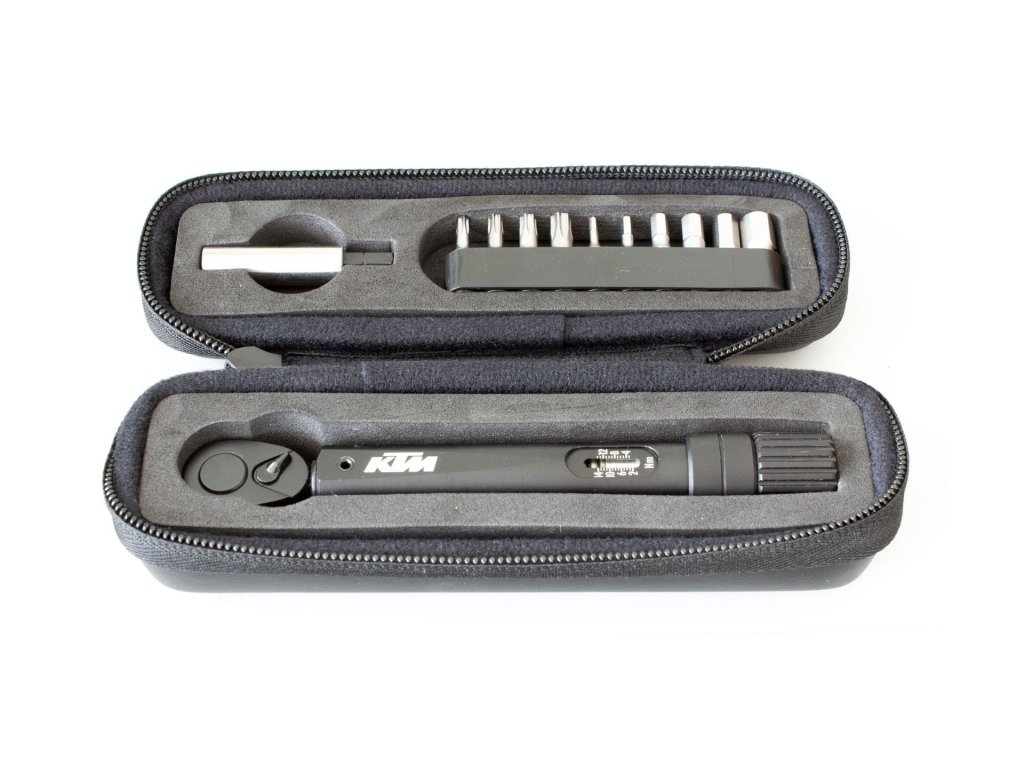 KTM TORQUE TOOL 2-14 NM – kvalitní momentový klíč z hliníku s rozsahem 2-14 Nm a tolerancí +/-4 %. Součástí je nástavec na bity a 10 bitů pro různé velikosti šroubů. Dodáváno v praktickém černém pouzdře. Hmotnost 360 g.