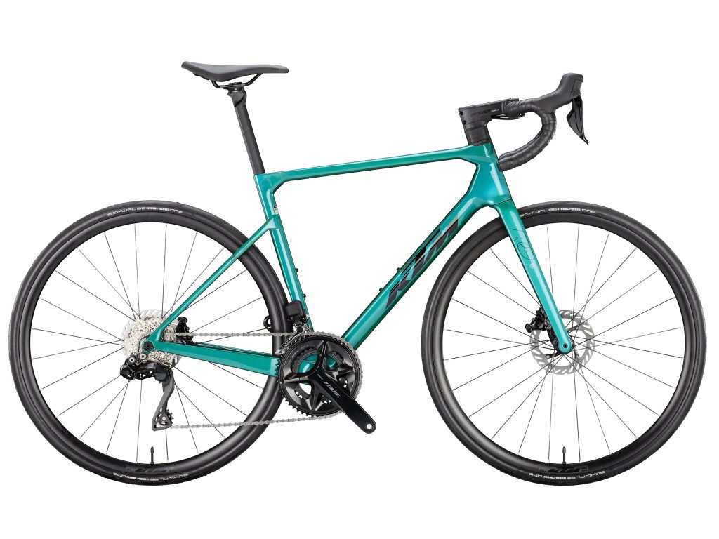 Silniční kolo KTM REVELATOR ALTO ELITE 2026 s karbonovým rámem, elektronickým řazením Shimano 105 Di2 a plášti Schwalbe One Perf. Ideální volba pro závodní i rekreační jezdce.